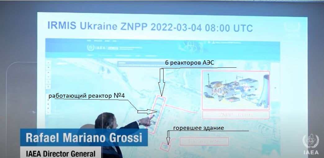 Генеральный директор МАГАТЭ Рафаэль Мариано Гросси на пресс-конференции 4 марта в Женеве сообщил аналогичные данные. Гросси также сообщил, что системы безопасности реакторов Запорожской АЭС не пострадали, работают в штатном режиме, выбросов радиации не зафиксировано. Работающий реактор №4 Запорожской АЭС, по данным Гросси, загружен на 60% мощности.