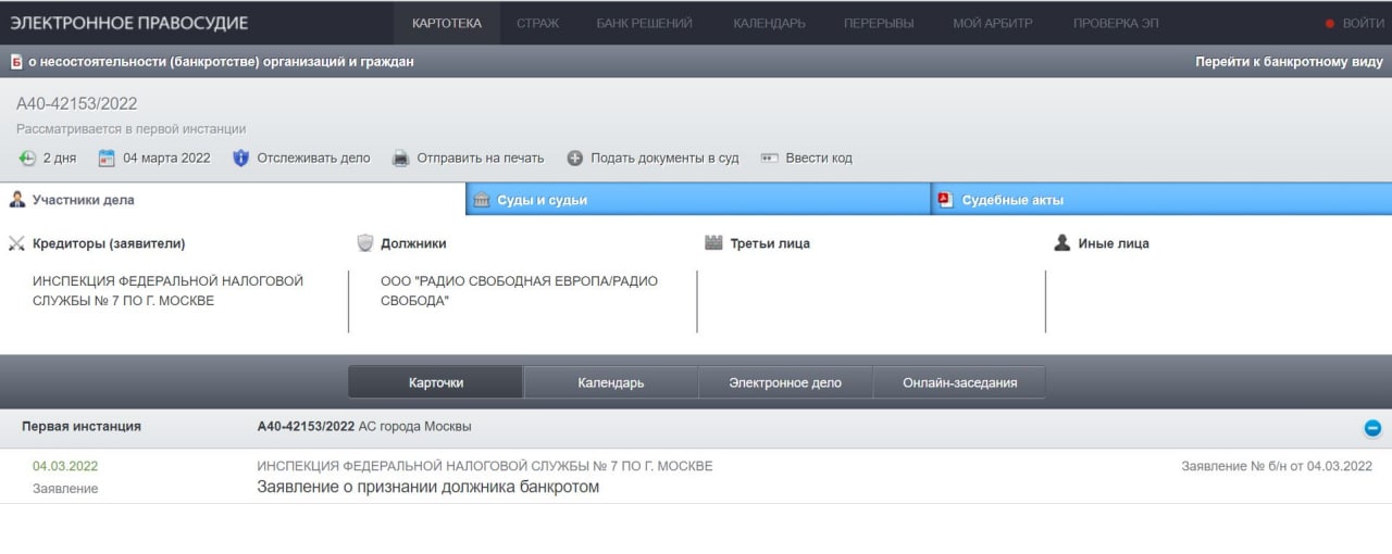В заявлении сообщается, что местные налоговые органы 4 марта 2022 года подали в суд заявление о банкротстве российского подразделения «Радио «Свобода». А полиция усилила давление на журналистов издания.