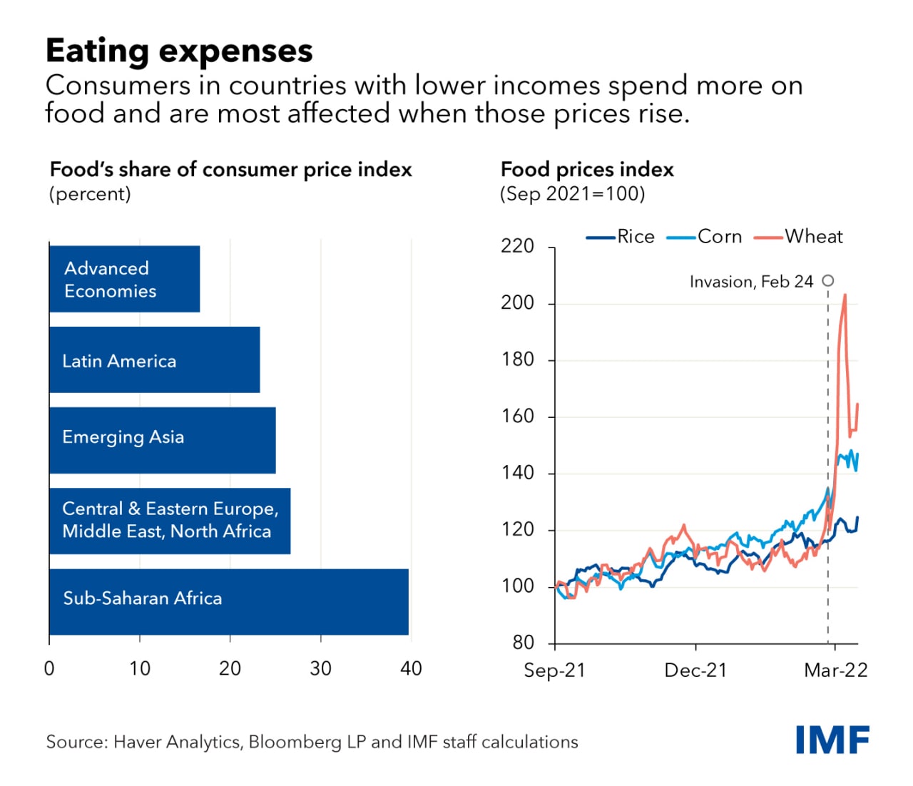 Диаграмма недели показывает, как ценовые потрясения повлияют на мир, особенно на бедные домохозяйства, для которых продукты питания составляют более высокую долю расходов. Расходы на продукты питания составляют 17% потребительских расходов в странах с развитой экономикой и 40% в странах Африки к югу от Сахары.