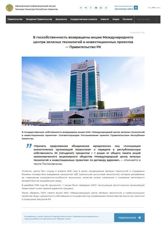 ‼️‼️ 50% + 1 акция НАО «Международный центр зеленых технологий и инвестиционных проектов» возвращены в государственную собственность постановлением правительства Казахстана.