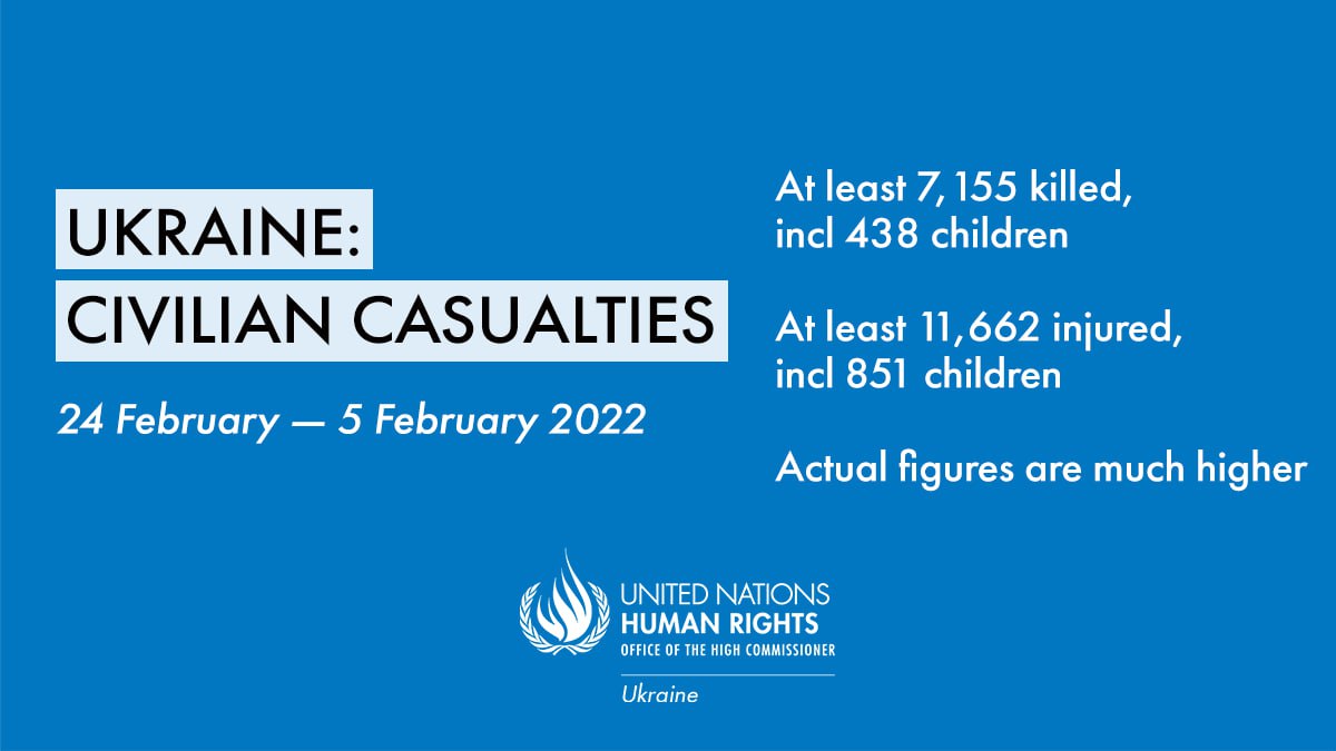 C 24 февраля 2022 года по 5 февраля 2023 года Управление Верховного комиссара ООН по правам человека (УВКПЧ ООН) зафиксировало 18 817 случаев гибели или ранения гражданских лиц в стране: 7 155 погибших и 11 662 раненых: