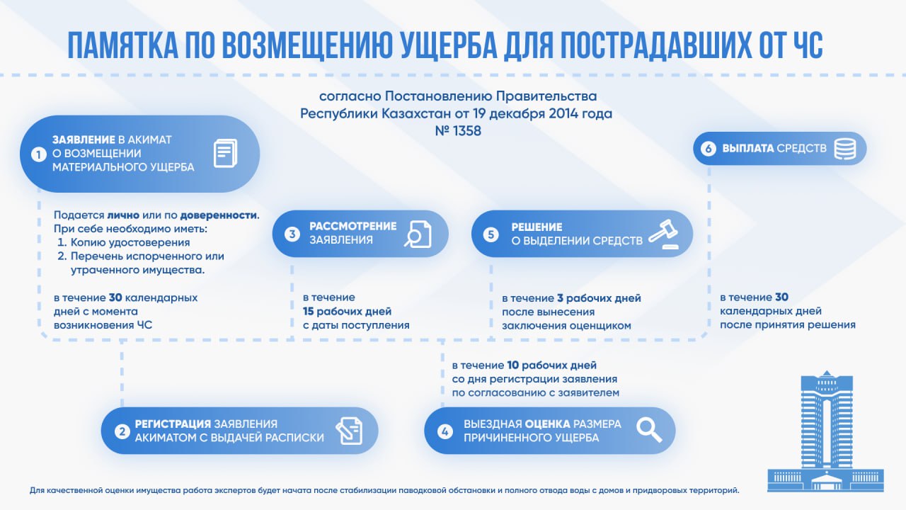 «Памятку по возмещению ущерба для пострадавших от ЧС» опубликовал официальный сайт премьер-министра Казахстана на основании «Правил возмещения вреда (ущерба), причиненного пострадавшим вследствие чрезвычайных ситуаций природного характера», утвержденных постановлением правительства РК №1358 от 14 декабря 2014 года.