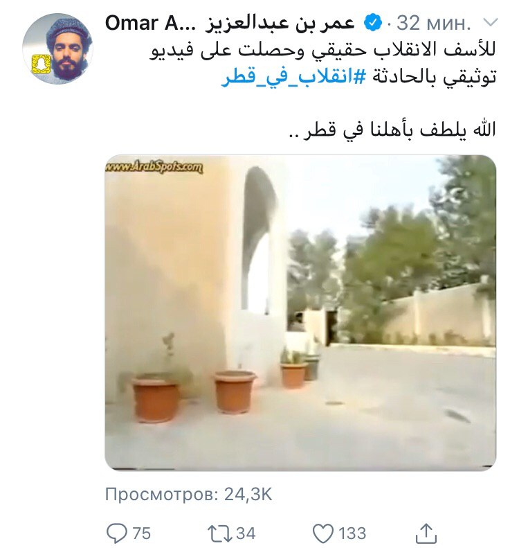 Твиттер наполняется сообщениями с хэштегом #انقلاب_في_قطر (переворот в Катаре). Вот один из твитов на эту тему от саудовского пользователя.