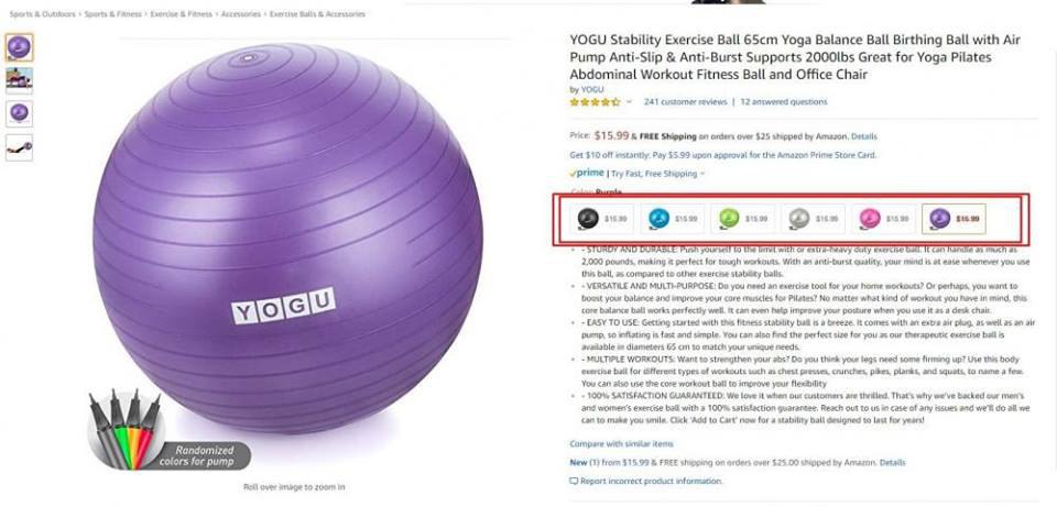 Ключевые слова, включенные в состав одного из child-листингов, не влияют на ранжирование других child-листингов. Например, если ваши фитнес-мячи идут в комплекте с насосами, но фразу "exercise ball with pump" вы включите только в листинг с фиолетовым мячом, то в результатах поиска по запросу "exercise ball with pump" будет только фиолетовый мяч, а красный, зеленый и т.д. по этому запросу вы найти не сможете.