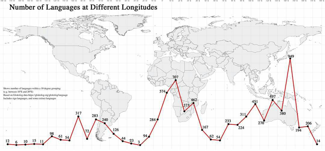 Астрологи объявили неделю лингвистики, поэтому сегодня будут посты про языковое разнообразие. Сначала - очень интересная визуализация количества языков в мире по меридианам. Главные пики - это Папуа и запад тропической Африки.