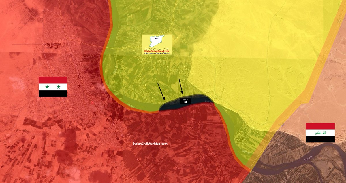 Боевики контролируют лишь узкую полосу побережья реки Евфрат и в скором времени окончательно сломаются. Карта ситуации внизу 👇
