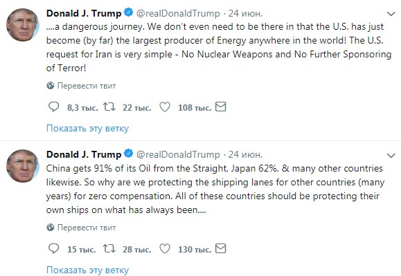 "Китай получат 91% своей нефти через Ормузский пролив. Япония получает 62%, и другие страны точно также. Почему мы защищаем эти морские маршруты вместо них (на протяжении многих лет), не получая ничего взамен. Все эти страны должны защищать собственные корабли во время этого опасного путешествия, коим оно всегда было".