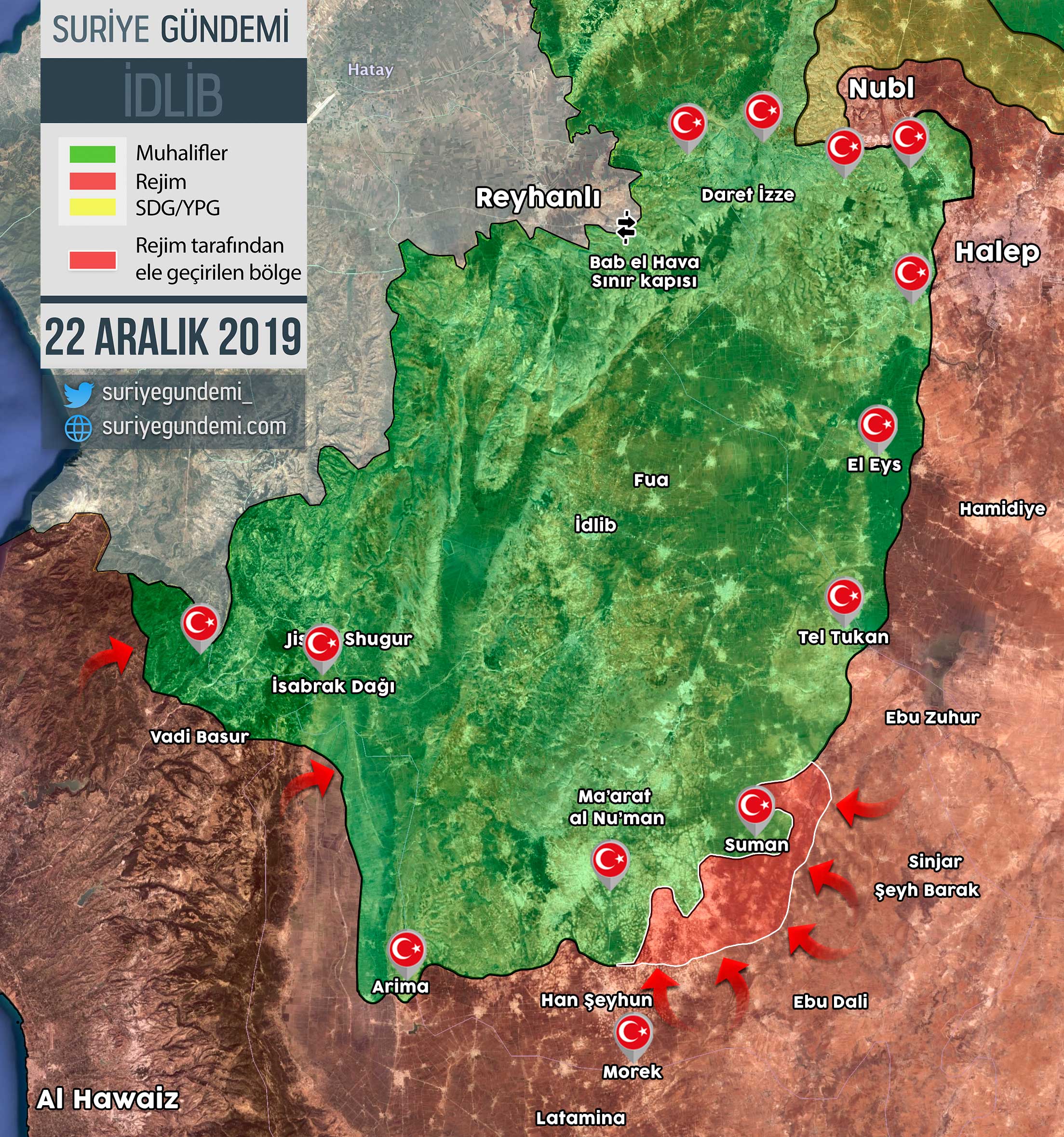 📌 Правительственные войска сумели почти вплотную подобраться к турецкому аванпосту №8 - опорнику, где стоят турецкие солдаты в рамках турецко-российских соглашений от 2018 года о зонах де-эскалации. Теперь турки окружены, точно также, как когда-то окружали их наблюдательный пункт весной во время первой фазы операции.