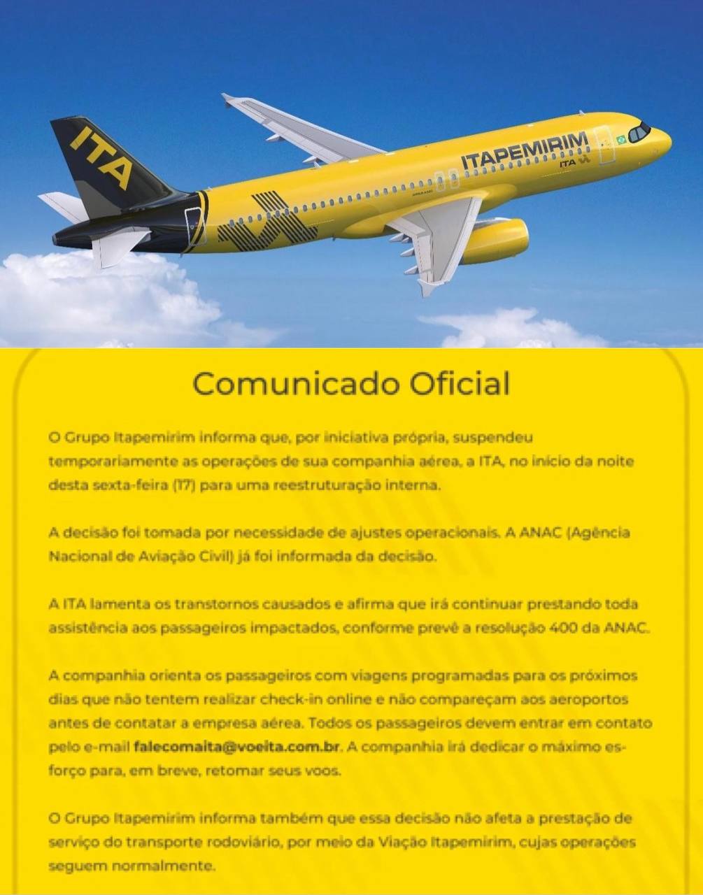 В заявлении компании говорится: «ITA временно приостанавливает все свои операции. Группа Itapemirim сообщает, что по собственной инициативе она временно приостановила деятельность своей авиакомпании ITA ранним вечером этой пятницы (17) для внутренней реструктуризации. Решение было принято в связи с необходимостью оперативной корректировки. ANAC (Национальное агентство гражданской авиации) уже проинформировано об этом решении».