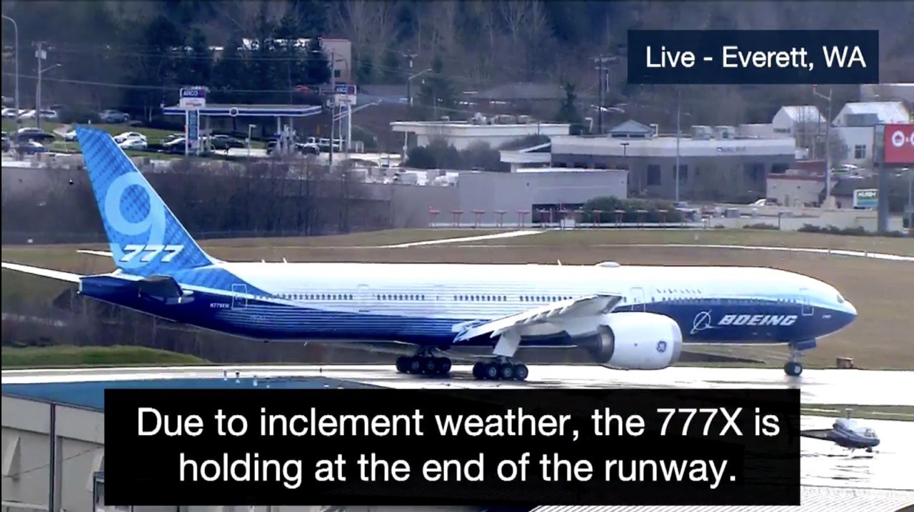 Уже менее, чем через 1,5 часа должен состояться первый полёт нового широкофюзеляжного самолёта Boeing 777Х, перенесённый со вчера по причине плохой погоды.