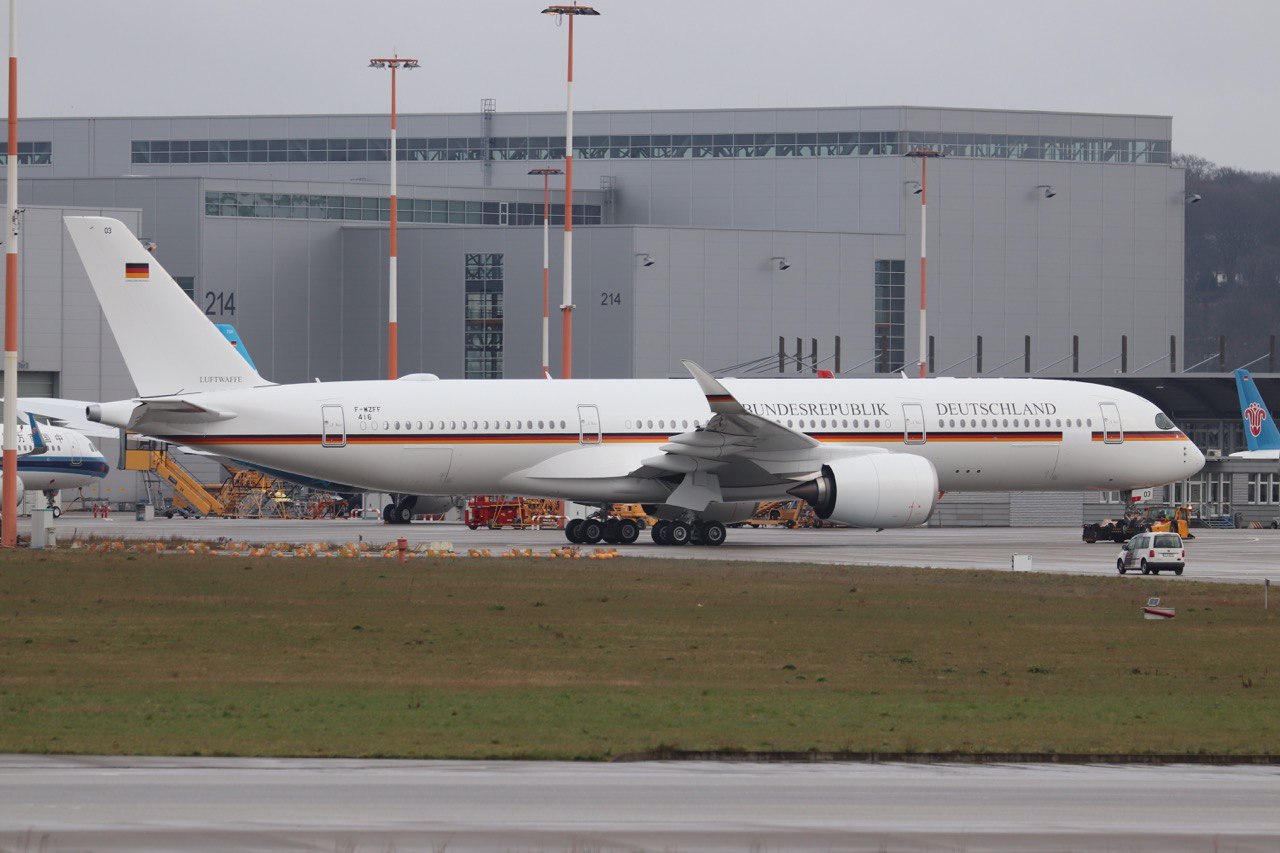 Сегодня появились первые фотографии Airbus ACJ350-900 (серийный номер MSN 416) для специального подразделения ВВС Бундесвера - Воздушного флота правительства Германии (Flugbereitschaft des Bundesministeriums der Verteidigung) в полной окраске, снятые на заводе Airbus в Гамбурге (XFW/EDHI).
