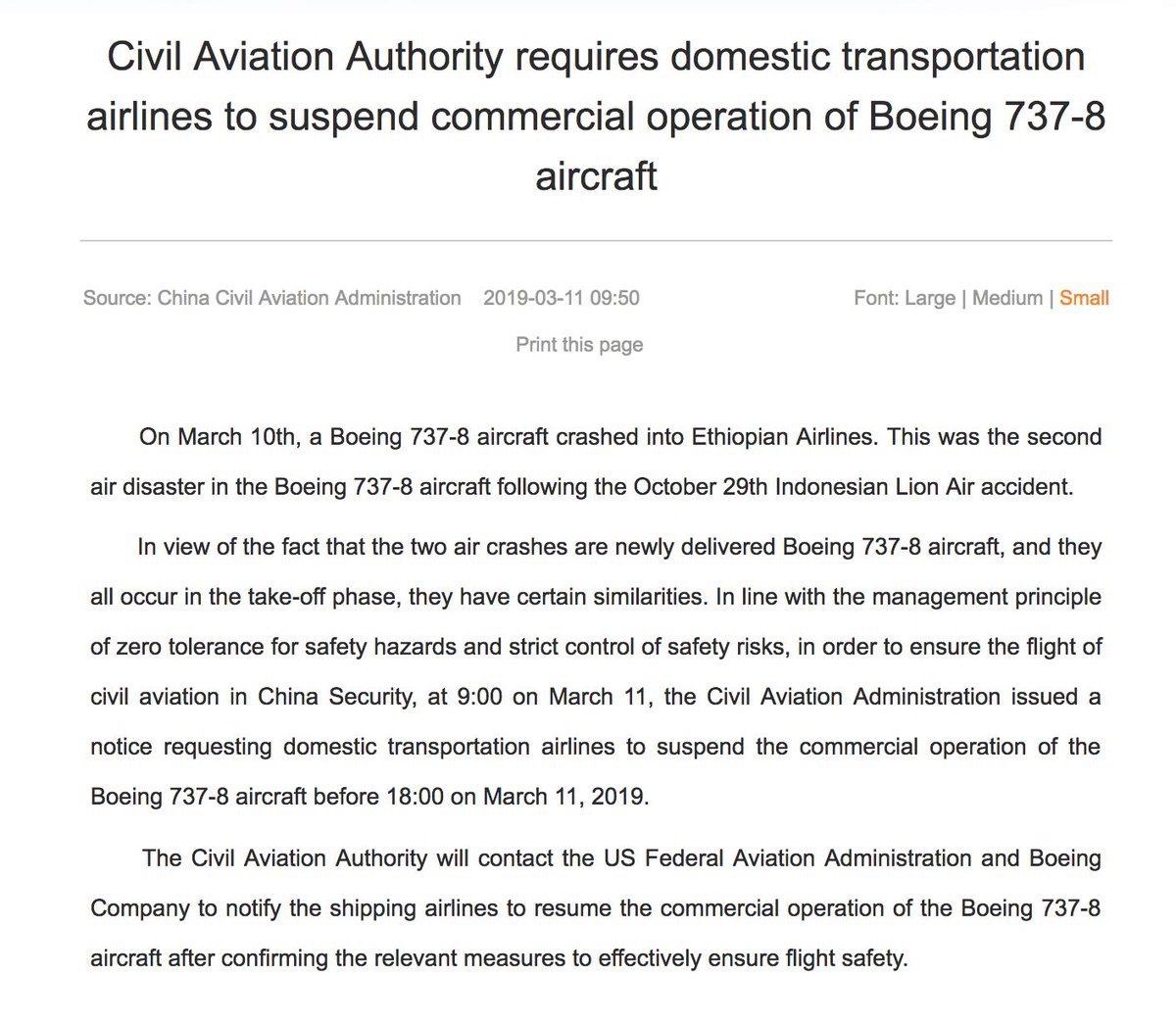 В своем официальном заявлении СААС собщила, что ввиду схожести двух катастроф самолетов 737-8, следуя принципам нулевой терпимости к угрозам безопасности и строгому контролю рисков безопасности, администрация издалет указание о приостановке домашних перевозок самолетами Boeing 737-8 не позднее 18:00 11 марта 2019 г.