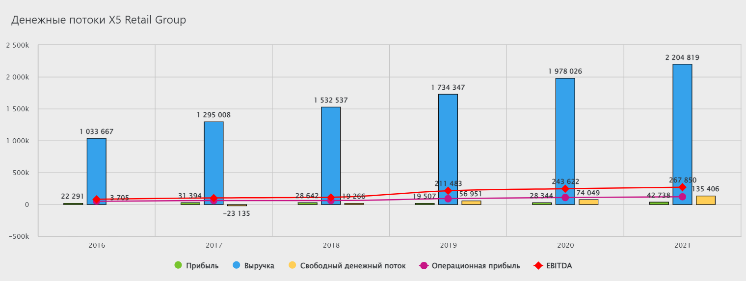 Отличная компания с растущей выручкой и чистой прибылью. Является лидером на рынке и показывает устойчивый и, самое главное, быстрый рост бизнеса. У X5 Group довольно высокая рентабельность капитала. Также из положительных моментов - весь долг X5 номинирован в рублях, поэтому не стоит беспокоиться о дальнейшей девальвации рубля.