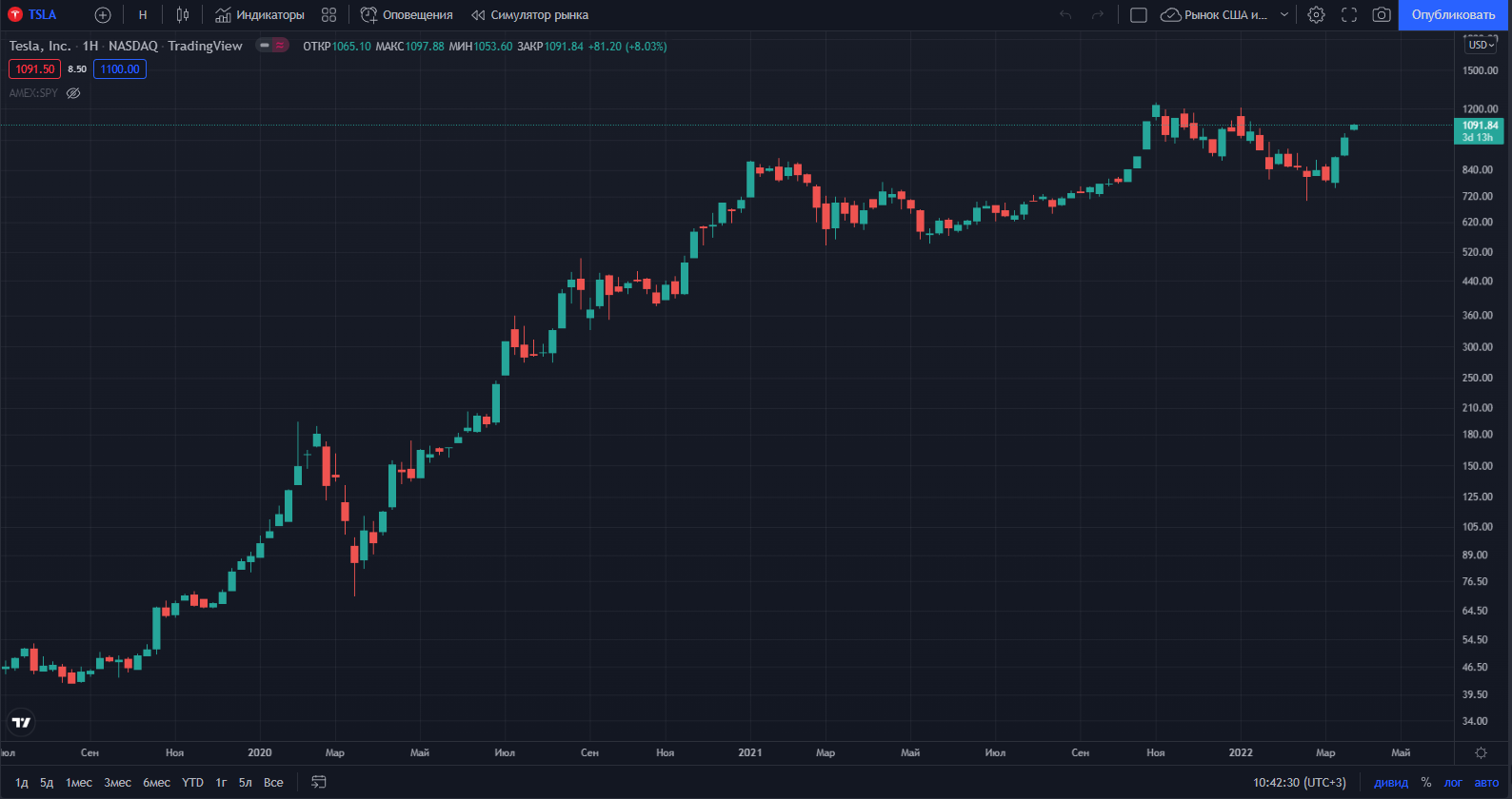 Если взглянуть на акции компании Tesla в динамике, за 5 лет можно увидеть рост в ~2000%, за год – в ~80%, за месяц – в 26%. Конечно, Тесла - это далеко не космос, но со своими делами справляется на ура.