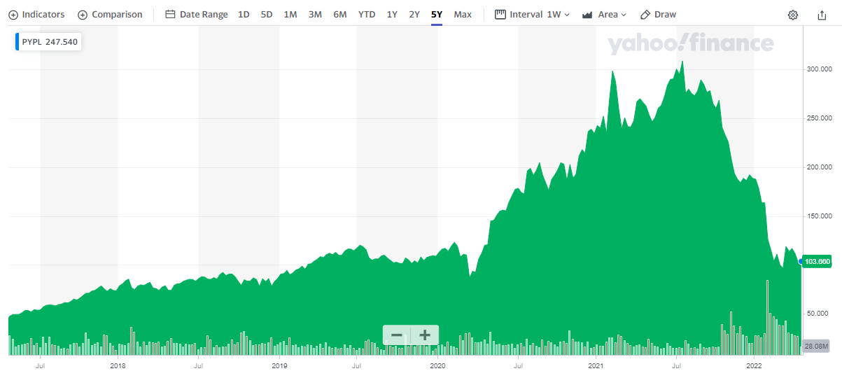 В последнее время котировки акций PayPal сильно штормит. То они растут в пандемию на 200% то потом складываются на 63% после начала цикла повышения ставок. Но на мой взгляд сейчас акции компании находятся на привлекательном уровне и вот почему: