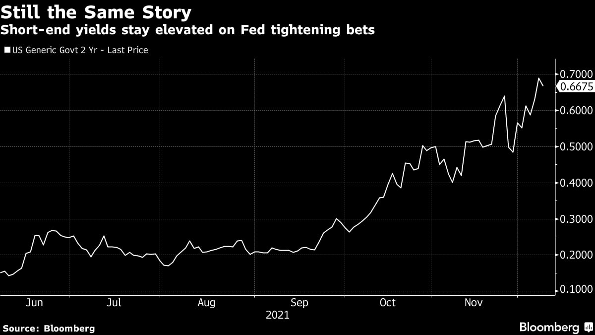 Доходность двухлетних казначейских облигаций сегодня немного снизилась, но за последние два дня выросла на 10 базисных пунктов. Денежный рынок оценивает цены в диапазоне от двух до трех повышений к концу 2022 года, причем шансы растут с пятницы. Показатель волатильности облигаций восстановился на этой неделе почти до самого высокого уровня с марта 2020 года.