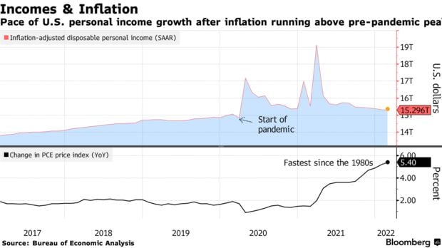 Инфляция, которая идет самыми быстрыми темпами с 1981 года, все больше сокращает зарплаты, и все больше долларов тратится на предметы первой необходимости, такие как еда, бензин и жилье. В то время как потребители пока держатся стойко и продолжают тратить, некоторые экономисты опасаются, что спрос в конечном итоге замедлится до такой степени, что может вызвать рецессию. Данные о расходах с поправкой на инфляцию будут опубликованы в пятницу.