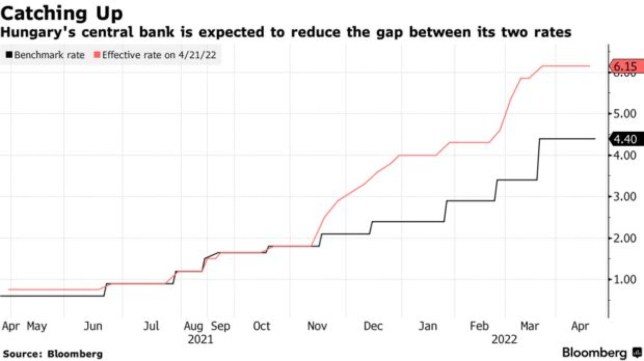 В то время как растущая инфляция, слабый форинт и ужесточение денежно-кредитной политики основными центральными банками указывают на дальнейшее повышение ставок в Венгрии, политикам еще предстоит довести дело до конца после того, как в марте было отмечено, что потребуется большее повышение ставок и на более длительный период, чтобы сдержать рост цен. Они сохранили недельную ставку без изменений в своих последних четырех решениях.
