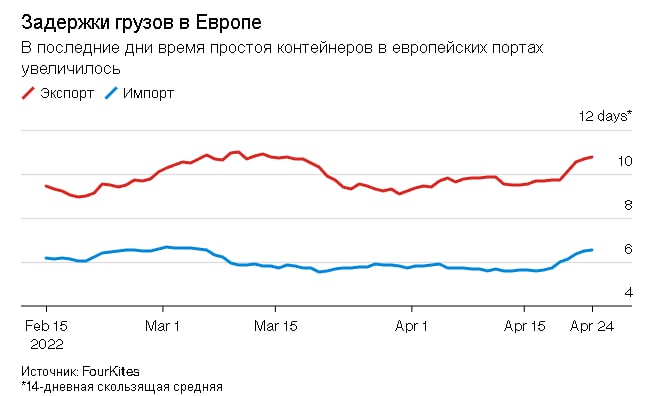 По данным чикагской FourKites, платформы для отслеживания цепочки поставок, среднее время простоя экспортных контейнеров в европейских портах по состоянию на 24 апреля составило 10,8 дня, по сравнению с 9,2 в середине февраля. Что касается импорта, то ожидание выросло с 6,2 до 6,5 дней.