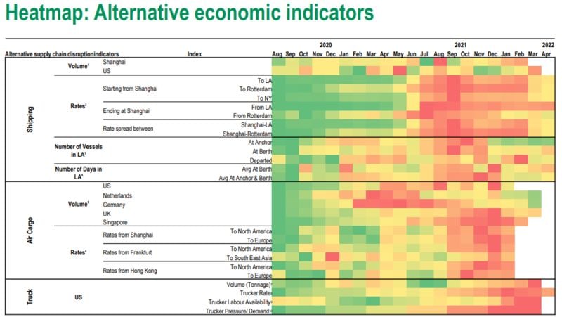 Многие экономисты, в том числе команда #Bloomberg, разработали индексы или красочные тепловые карты, чтобы показать степень напряжения на линиях поставок. В исследовательской заметке на этой неделе аналитики BNP Paribas SA опубликовали свой последний трекер, и он показал, что некоторые апрельские индикаторы мигают оранжевым и желтым.