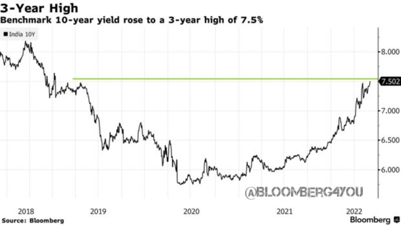 Доходность суверенных облигаций Индии впервые за три года превысила уровень в 7,5%, поскольку комиссия центрального банка по установлению ставок начала свое трехдневное заседание.