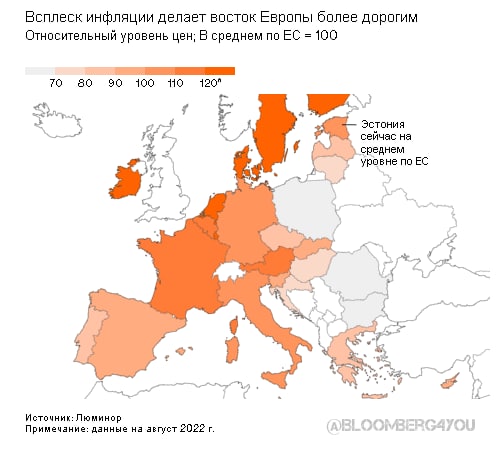 В Балтийском регионе, где инфляция является самой быстрой в блоке и превысила 25%, Эстония столкнулась с тем, что с прошлого года стоимость товаров и услуг обогнала Италию и Испанию, что сделало ее самой дорогой страной в Центральной и Восточной Европе. Словакия и Словения также набирают инфляционную силу и уже не сильно отстают.
