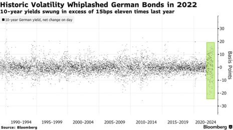 Историческая волатильность ударила по немецким облигациям в 2022 году, доходность 10-летних облигаций в прошлом году одиннадцать раз превышала 15 б.п.