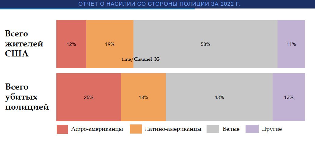 При этом в глаза бросается расовый дисбаланс (на илл.) между количеством чернокожих жителей США и числом убитых полицией, однако, нет данных о том, сколько из этих убийств совершенны такими же афро-американцами служащих в полиции. Вопрос этнического состава преступных группировок также является сложным для исследователей из-за угрозы быть обвинёнными в расизме, хотя тема куда сложнее банального цвета кожи, включает в себя социальные, экономические и прочие аспекты.