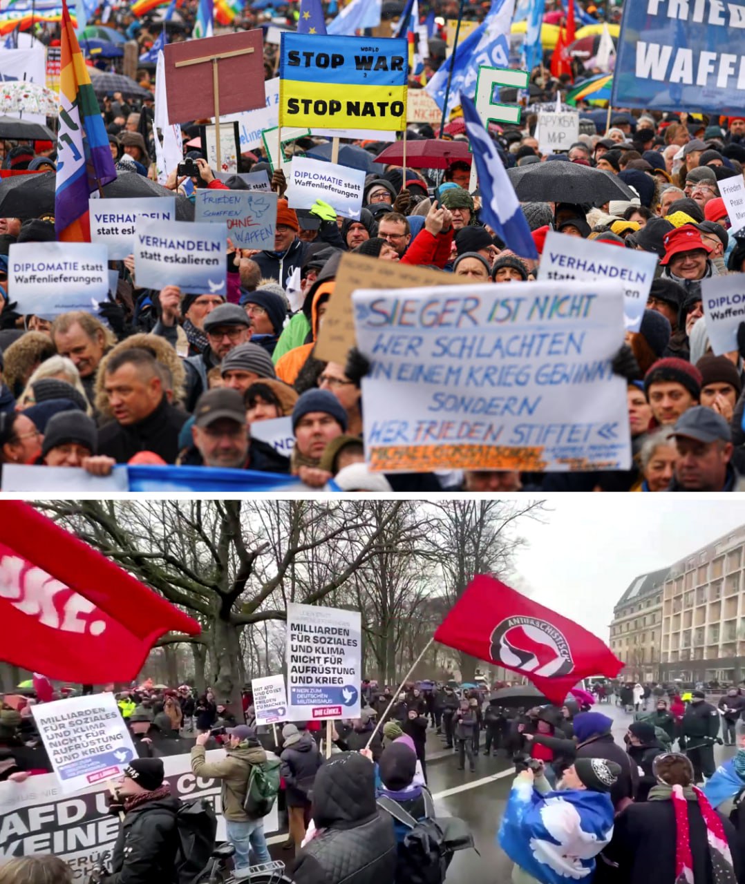🇩🇪 [Ультра] Левая партия ФРГ провела в Берлине митинг (на илл.) против поставок оружия Украине и за начало мирных переговоров с Россией, у Бранденбургских ворот собралось от 13 000 (по данным полиции) до 50 000 человек (по утверждению организаторов), представляющих левый фланг.