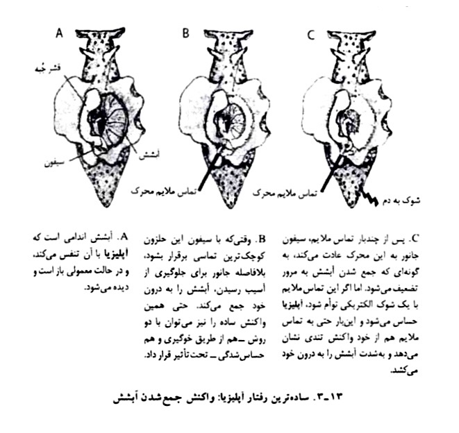 در خوگیری، لمس مکرر و آرام سیفون باعث میشود آپلیزیا آن را بیخطر تشخیص دهد و واکنش جمع شدن آبشش ضعیف شود. در حساسشدگی، شوک الکتریکی به سر یا دم پس از لمس آرام سیفون اعمال شد. پس از چندبار ترکیب لمس و شوک، لمس آرام بهتنهایی واکنش شدید جمع شدن آبشش را برانگیخت، زیرا حیوان تحریک را آزاردهنده یافت (تصویر ۱۳-۳C).