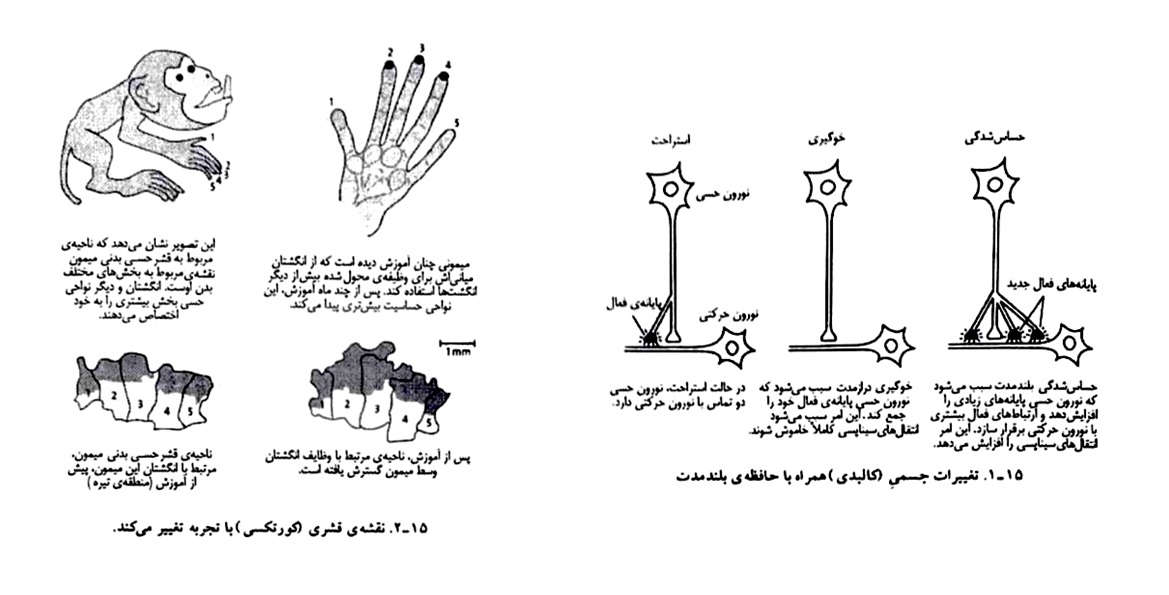 در دههی ۱۹۹۰، مایکل مرزنیچ کشف کرد که نقشهی قشری میمونها با تجربه تغییر میکند. میمونهای آموزشدیده برای چرخاندن صفحه با سه انگشت، ناحیهی قشری انگشتان وسطی بزرگتر و حساسیت بساوایی آنها افزایش یافت (تصویر ۱۵-۲). توماس ابرت نشان داد که ناحیهی قشری انگشتان دست چپ ویولونیستها، بهویژه در کسانی که پیش از ۳۰سالگی شروع کردند، تا پنج برابر بزرگتر است.