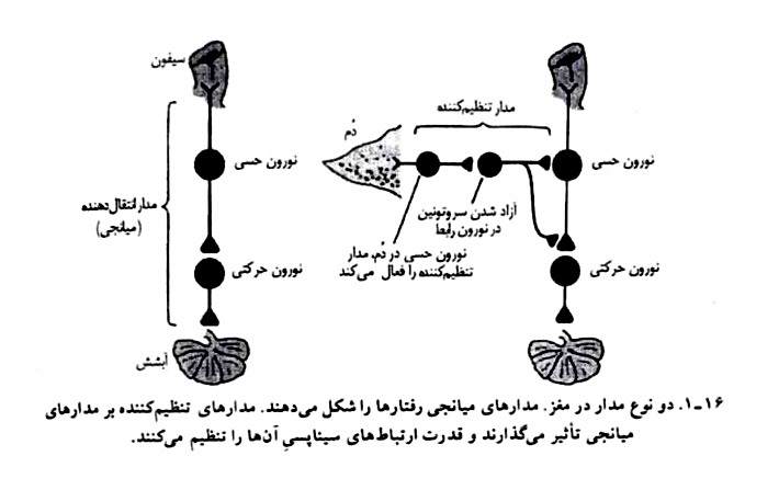 دو نوع مدار نورونی شناسایی شد: مدارهای میانجی، که رفتار را مستقیماً ایجاد میکنند، و مدارهای تنظیمکننده، که قدرت ارتباطات سیناپسی را تنظیم میکنند. مدارهای میانجی از نورونهای حسی سیفون، نورونهای رابط، و نورونهای حرکتی تشکیل شدهاند و در یادگیری اطلاعات جدید را کسب میکنند. مدارهای تنظیمکننده، مانند معلمی، رفتار را با تنظیم دقیق ارتباطات سیناپسی در پاسخ به یادگیری تغییر میدهند (تصویر ۱۶-۱). این یافتهها نشان داد که سروتونین بهعنوان یک ناقل عصبی تنظیمکننده، نقش کلیدی در حساسسازی و تقویت حافظهی کوتاهمدت دارد.