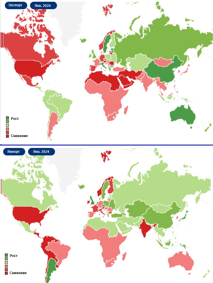 На рисунках 1 и 2 показано влияние падения грузооборота в Красном море на экспорт и импорт стран мира: зеленым – рост, красным – снижение.
