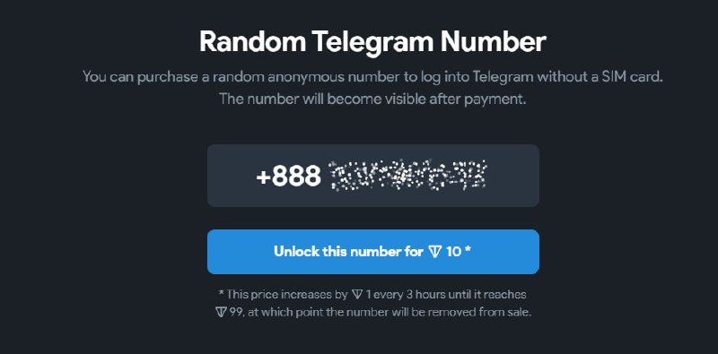 📝 Еще пару дней назад видел эту тему, TON ака Telegram запустили продажу анонимных номеров по 9 TON (20$) старт был примерно дней 5 назад. С сегодняшнего дня с (15:00) эти номера будут дорожать на 1 $TON каждые 3 часа, пока не достигнет 99 $TON, после чего сгенерировать новые номера будет нельзя!