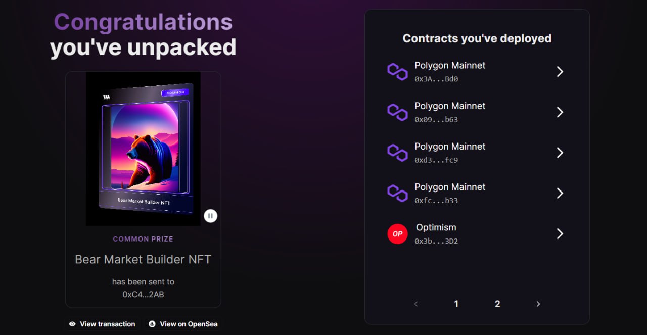 🧑💻 Если вы делали деплоит контракта в сетях Ethereum, Polygon, Avalanche, Arbitrum, Optimism в промежутке с 1 Января 2022 года до 1 Апреля 2023 года, то вы можете забрать себе 1 NFT-пак в котором имеются награды.