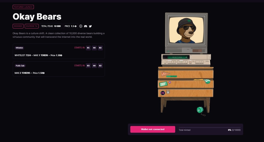 📝 Okay Bears - это коллекция на Solana из 10 000 NFT-медведей, максимально хайповая коллекция вайтлисты продаются за 200-250$ хоть и суплай не маленький.