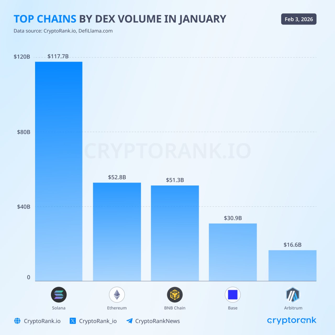 Solana recorded $117.7B in volume in January, posting a 20% MoM growth and outperforming other chains by a mile.