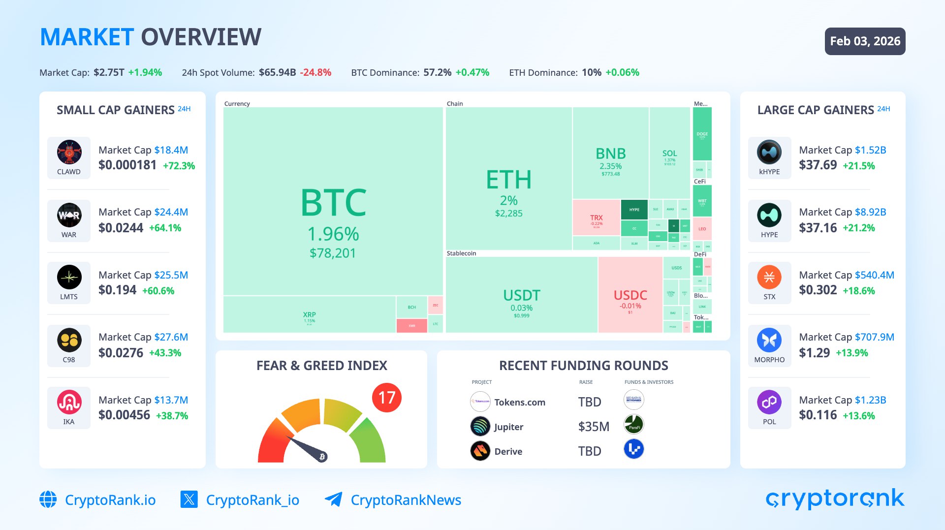 As the market keeps going down, BTC has recorded a 13% drop in a week and nearly lost the $75K support level, while ETH has fallen 23%, losing the $2,200 level. Total crypto market cap has fallen 14% and is now around $2.65T.