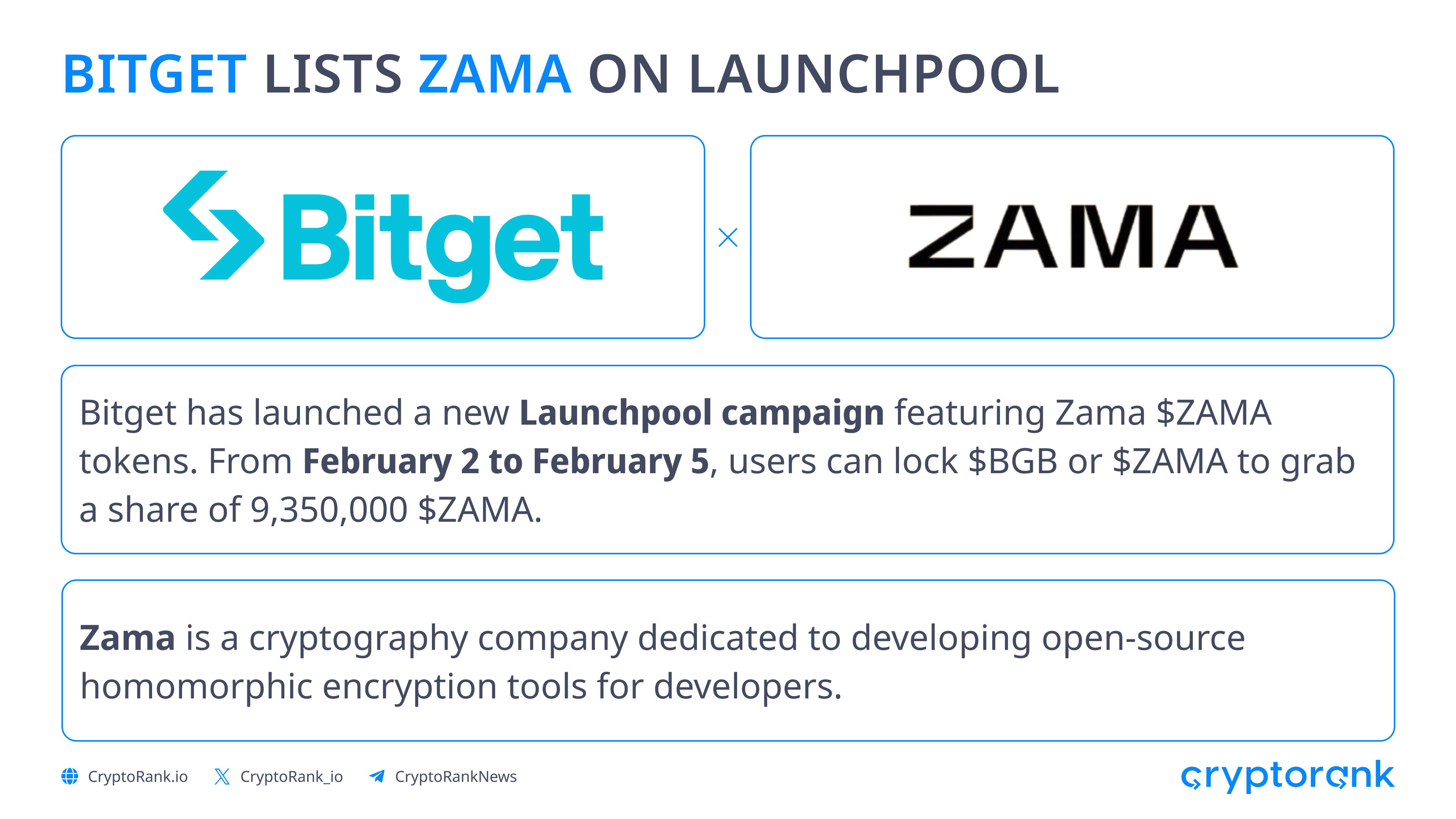 Bitget has launched a new Launchpool campaign featuring Zama (ZAMA). From February 2 to February 5, users can lock BGB or ZAMA to grab a share of 9,350,000 ZAMA.