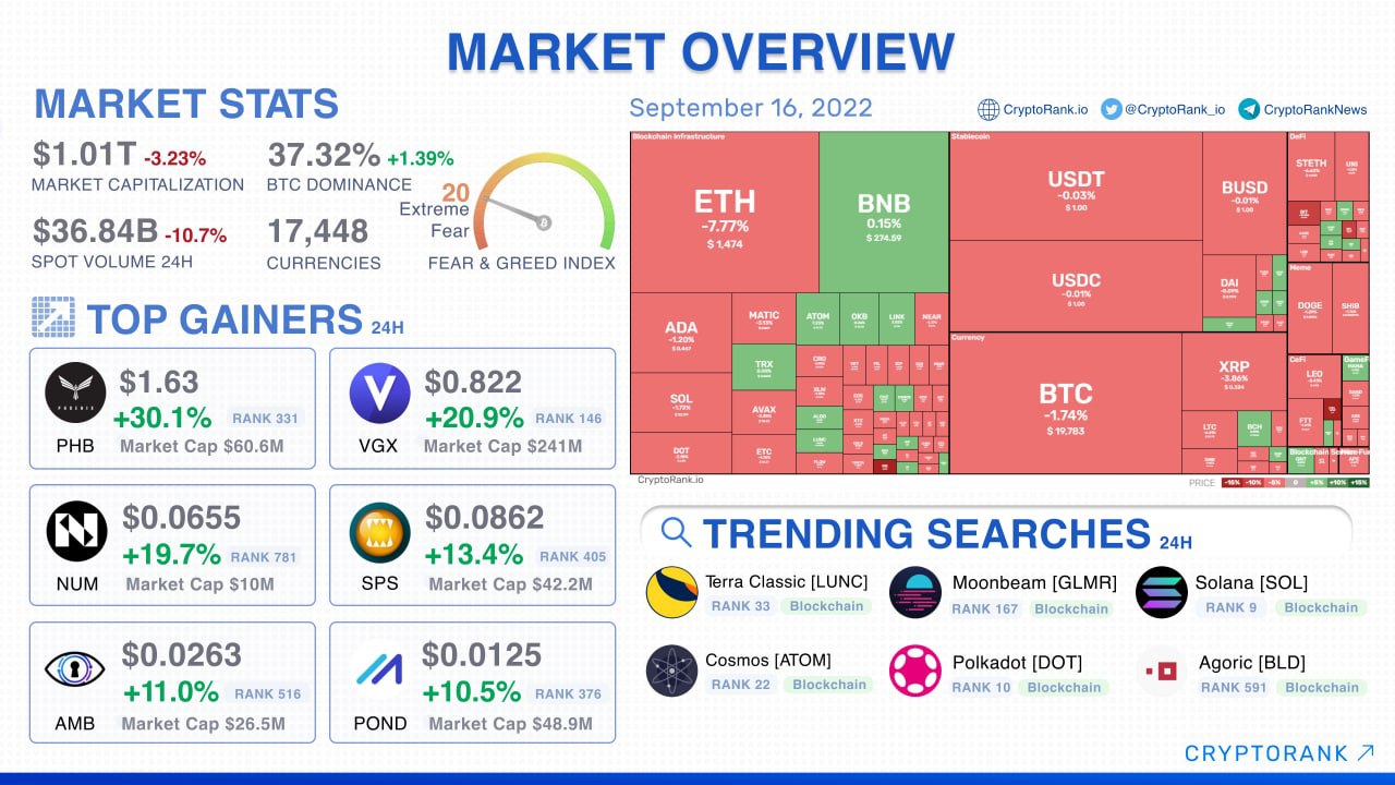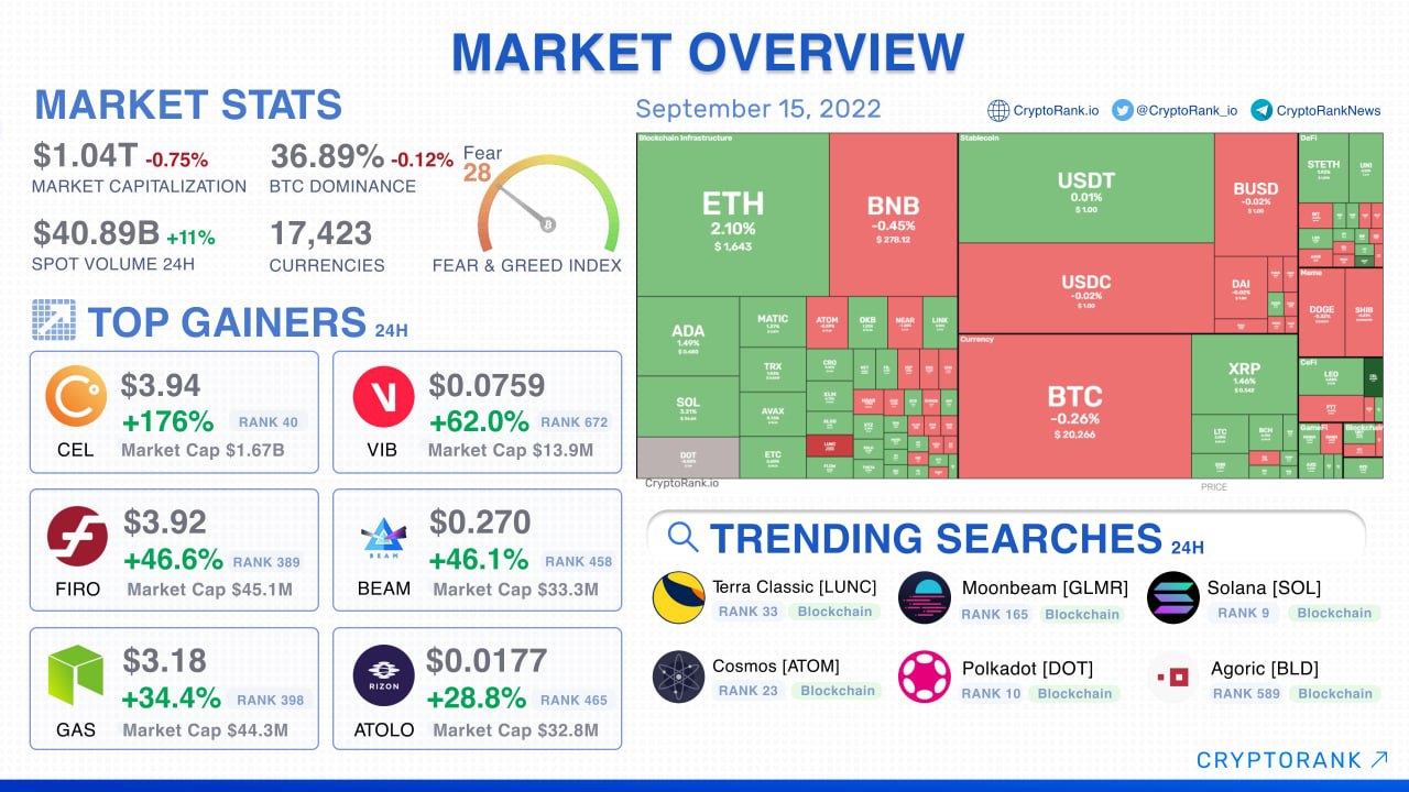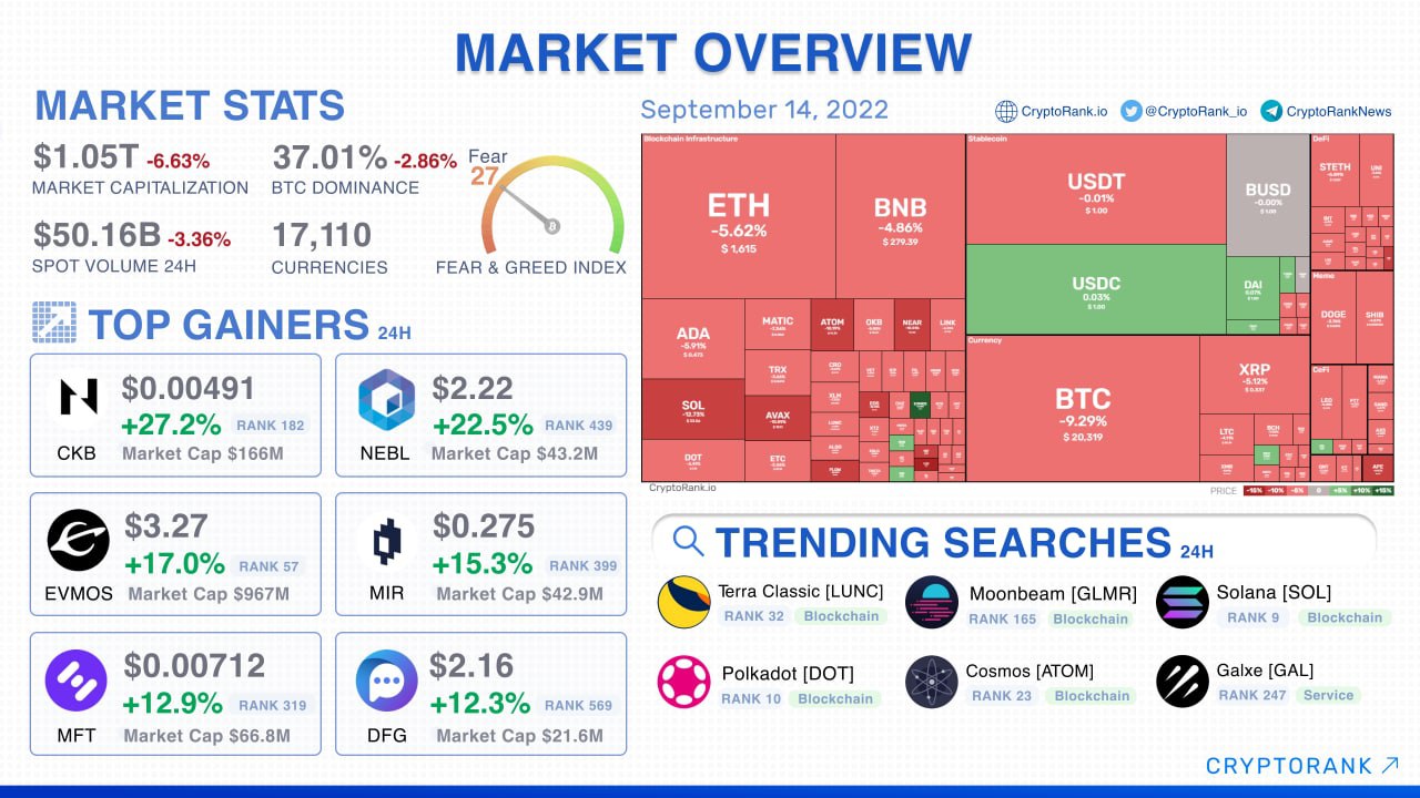 Uncertain BTC price action continues as Ethereum trends downward despite the successful Merge. Data from CryptoRank.io showed Bitcoin spiking below $20,000 again overnight to recover marginally above the boundary for a brief period. Altcoin markets meanwhile were led by the story-that-wasn’t on Ethereum, which failed to react positively to the Merge. ETH is down nearly 8% over the last 24 hours, circling $1,470 amid significant volatility.