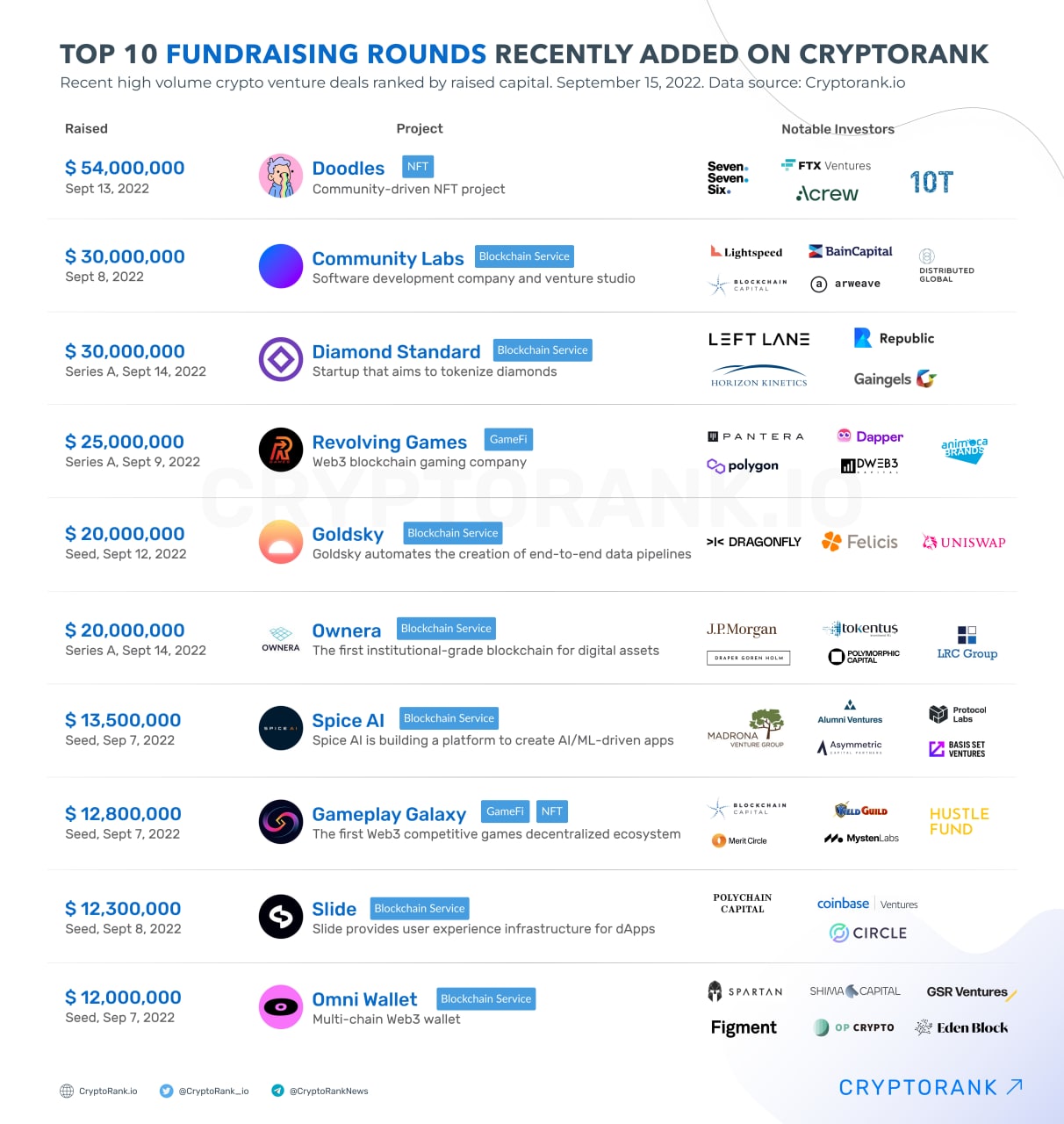 Doodles leads, followed by Community Labs, Diamond Standard and Revolving Games. For more insights, visit Funding Rounds page.