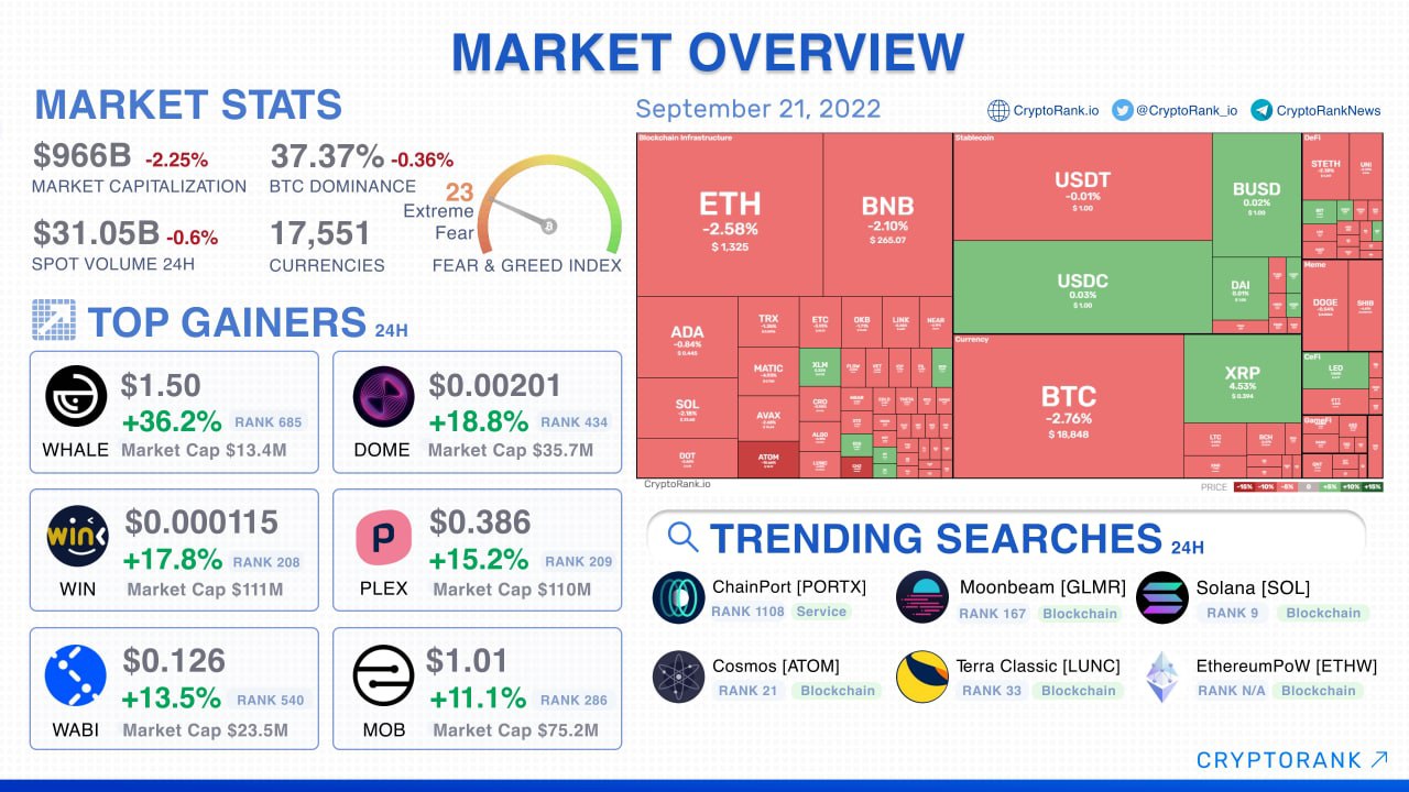 After a significant drop on September 21 due to the Fed rate hike, Bitcoin (as well as a broader market) managed to recover and rise above $19,000. Bitcoin is currently trading around $19,291, which represents a +2.70% increase over the past 24 hours.