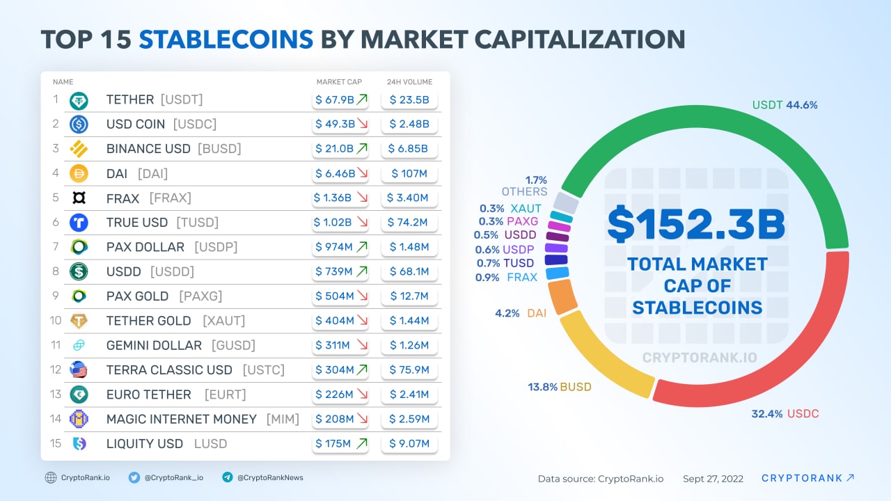 Over the past month the total market cap of stablecoins showed a significant decrease. While the supply of USDT and BUSD increased over the past month, the supply of USDC showed another month of decline. Other stablecoins have not undergone any noticeable changes. The top 5 stablecoins account for almost 96% ($146 billion) of the total supply of stablecoins.