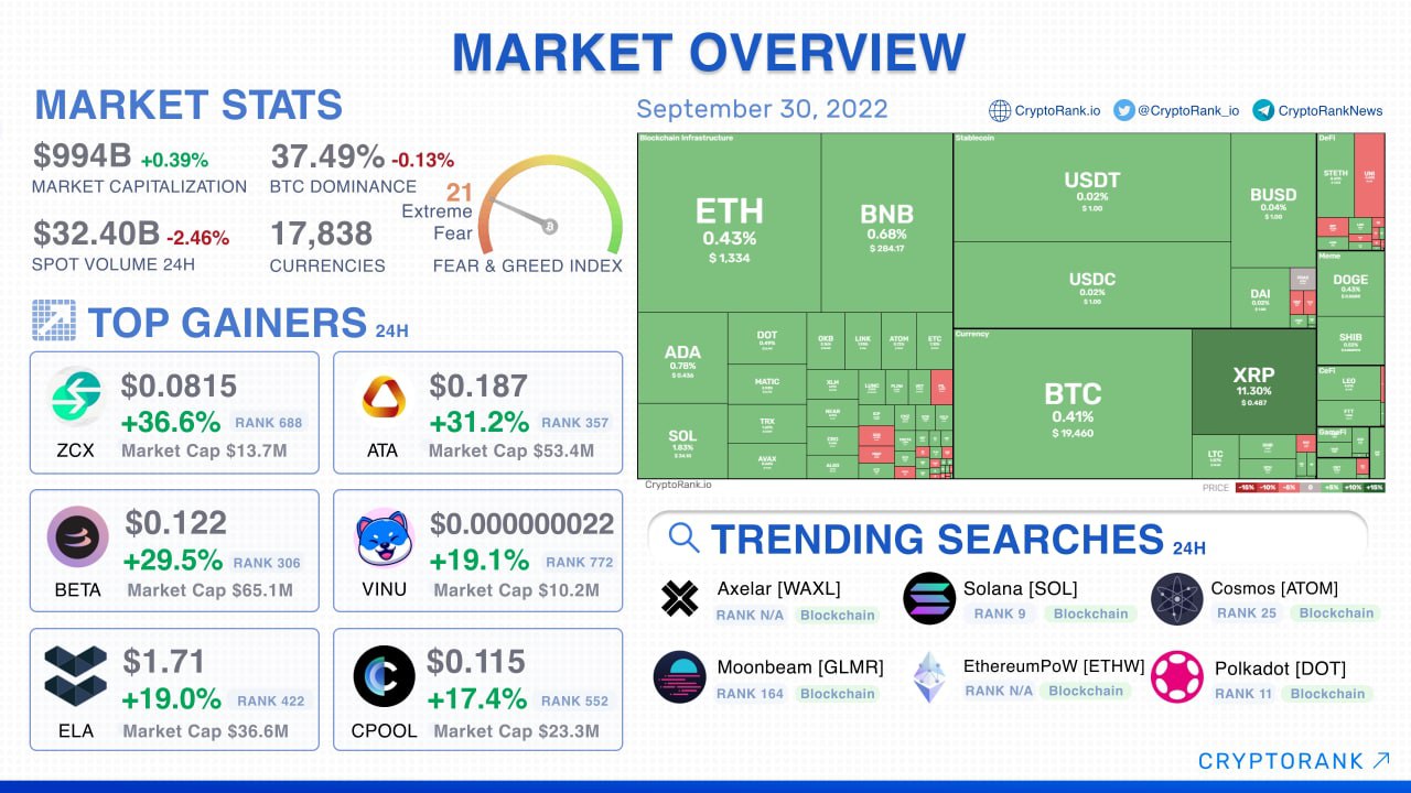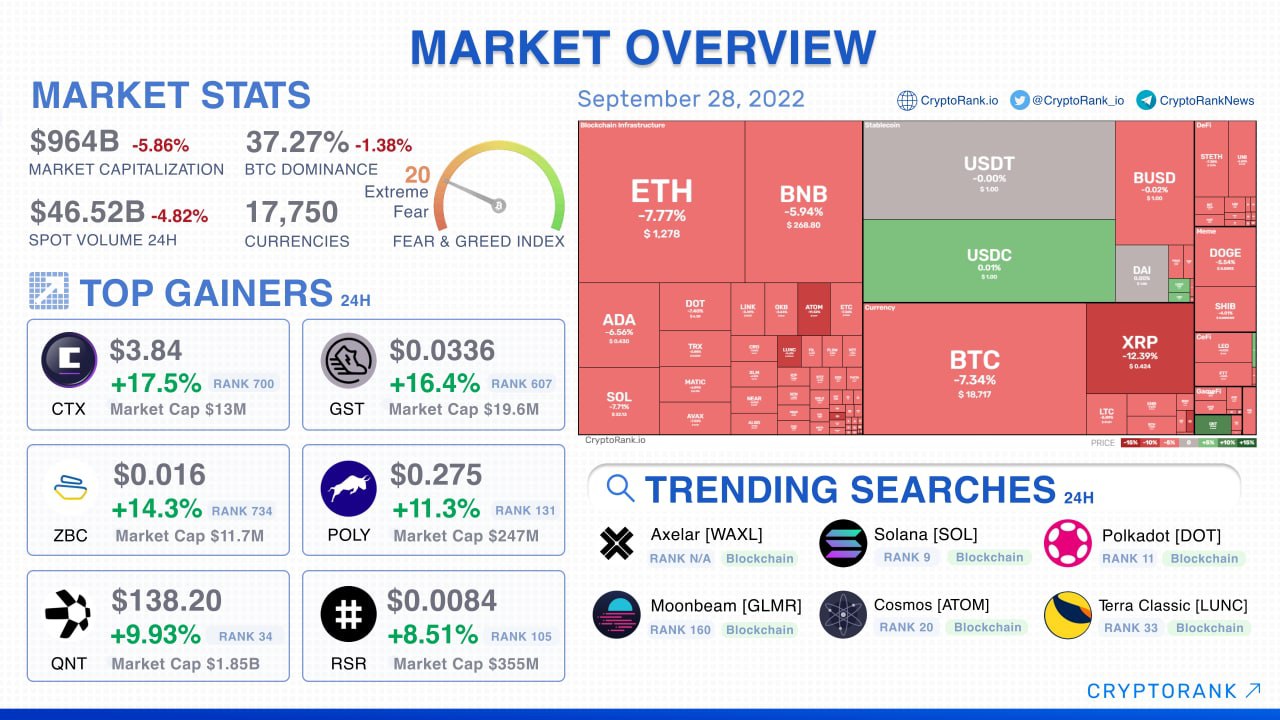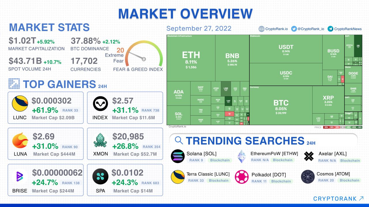 Bitcoin and the broader market showed enormous gains in the first trading hours on September 27. Data from CryptoRank.io showed BTC rising above $20,000. Bitcoin is up 8.05% over the last 24 hours and is currently trading around $20,199.