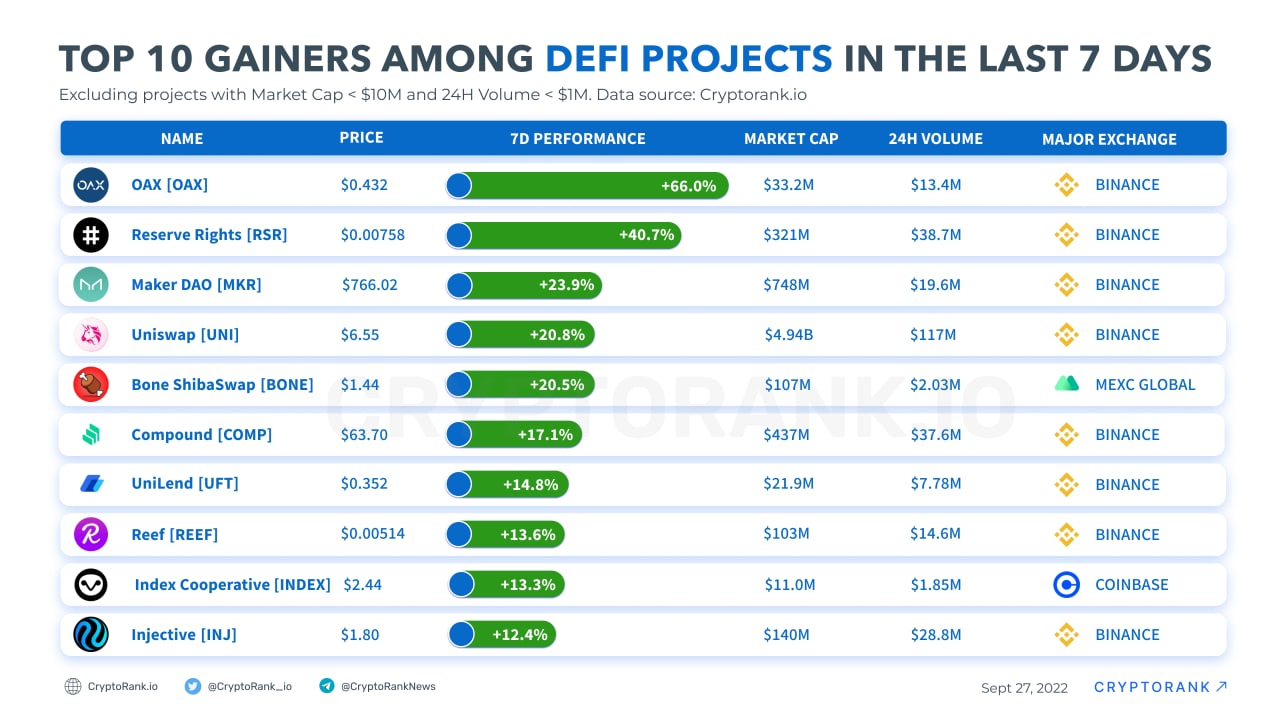 Top 10 Gainers Among DeFi Projects in the Last 7 days 📈