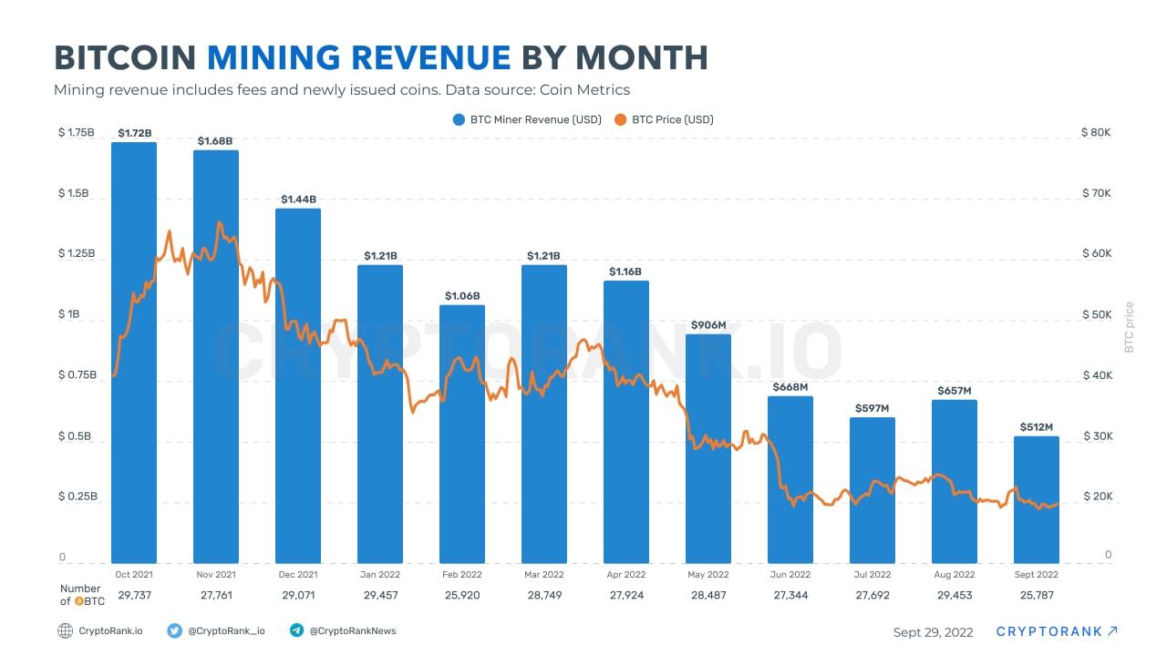 In September 2022, Bitcoin mining revenue showed a decrease of 22% from the revenue registered in August: $657M —> $512M. The loss primarily caused by the decline in the number of mined Bitcoins.