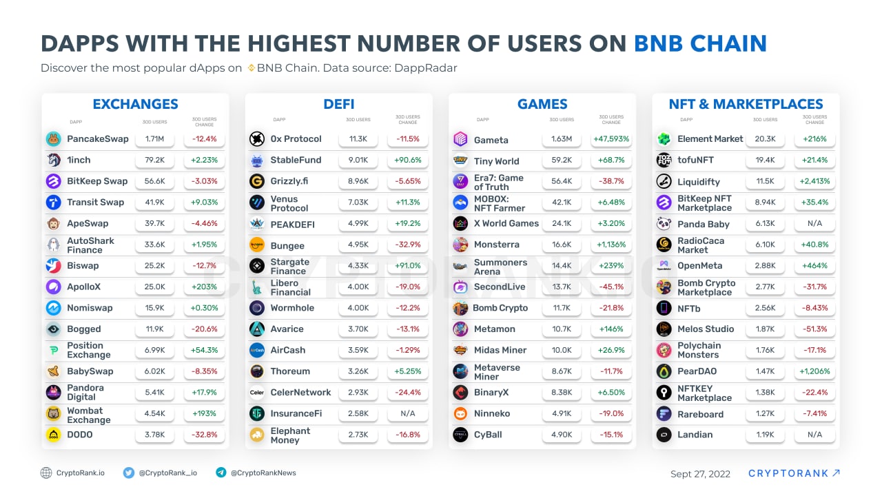 Discover the most popular exchanges, DeFi protocols, games, NFT projects, and marketplaces on BNB Chain during past 30 days.