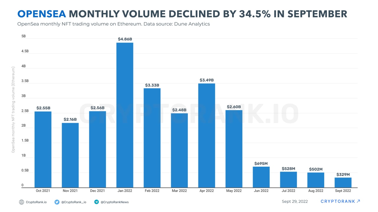 The monthly NFT trading volume on OpenSea (Ethereum) declined by 34.5% in September 2022, from $502M to $329M, the lowest volume since July 2021. The monthly NFT trading volume on OpenSea has fallen by 93% from ATH of $4.86B reached in January 2022.