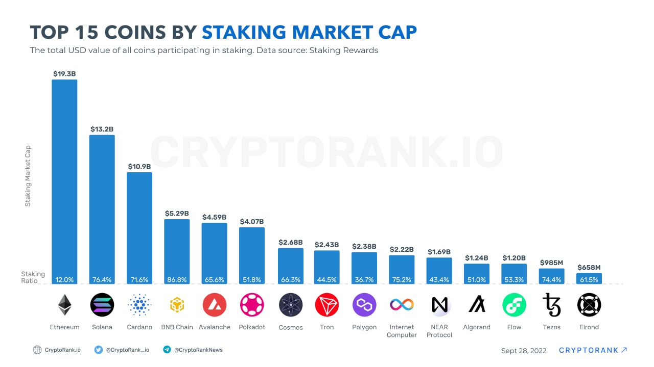 The majority of blockchains have increased their staking ratio over the last months, despite the decrease of market capitalizations caused by the market decline. Ethereum leads by staked value, followed by Solana, Cardano, and BNB Chain.