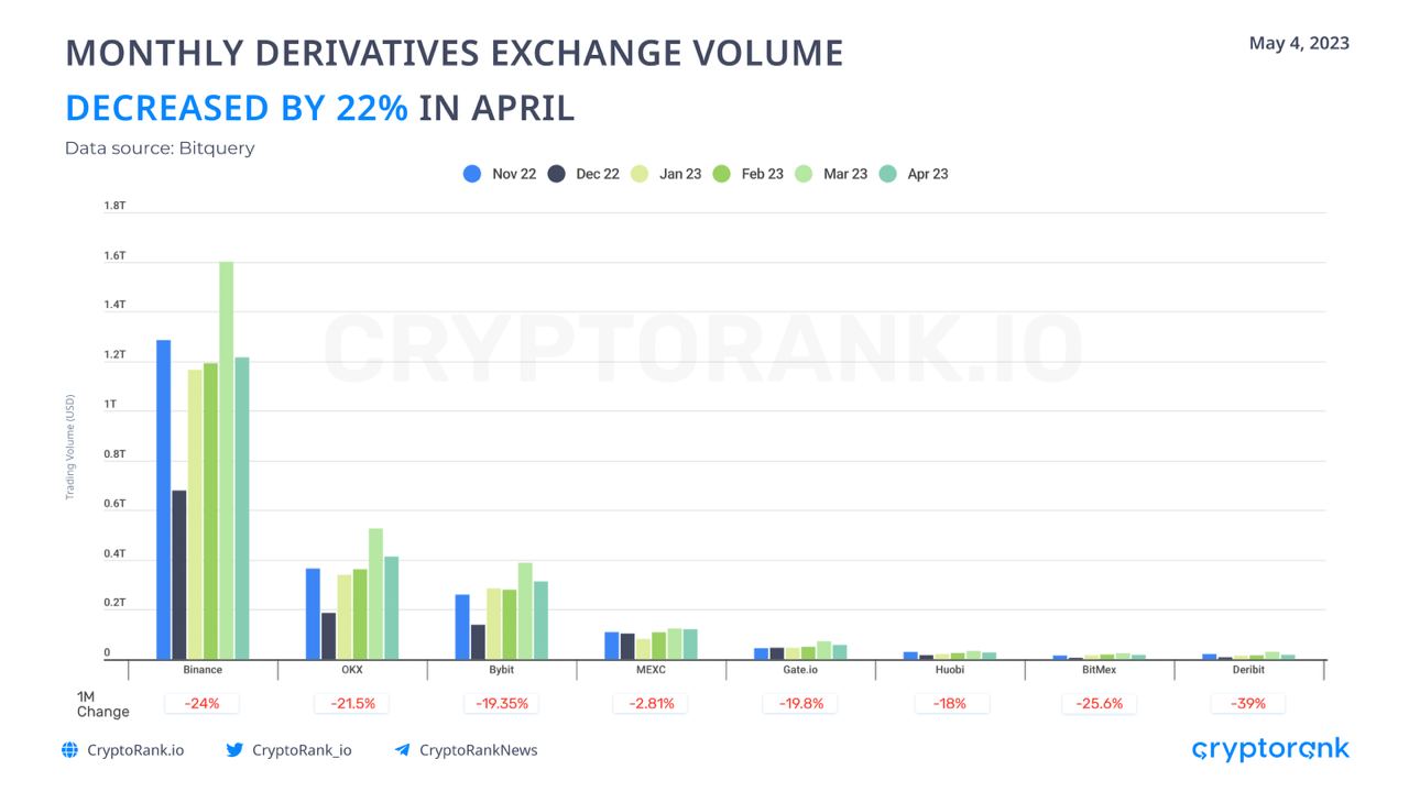 In April 2023, the monthly derivatives exchange volume showed a decrease of 22% compared to the volume registered in March: $2.8T —> $2.18T.